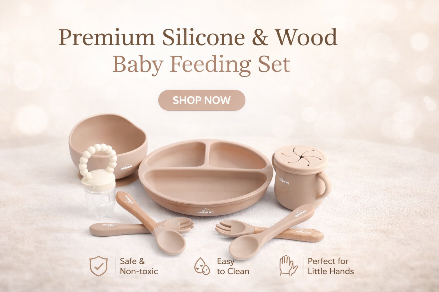 Honeybubs brings you a premium 10-Piece Silicone Baby Feeding Set—safe, durable, and designed to make feeding time easier and mess-free.