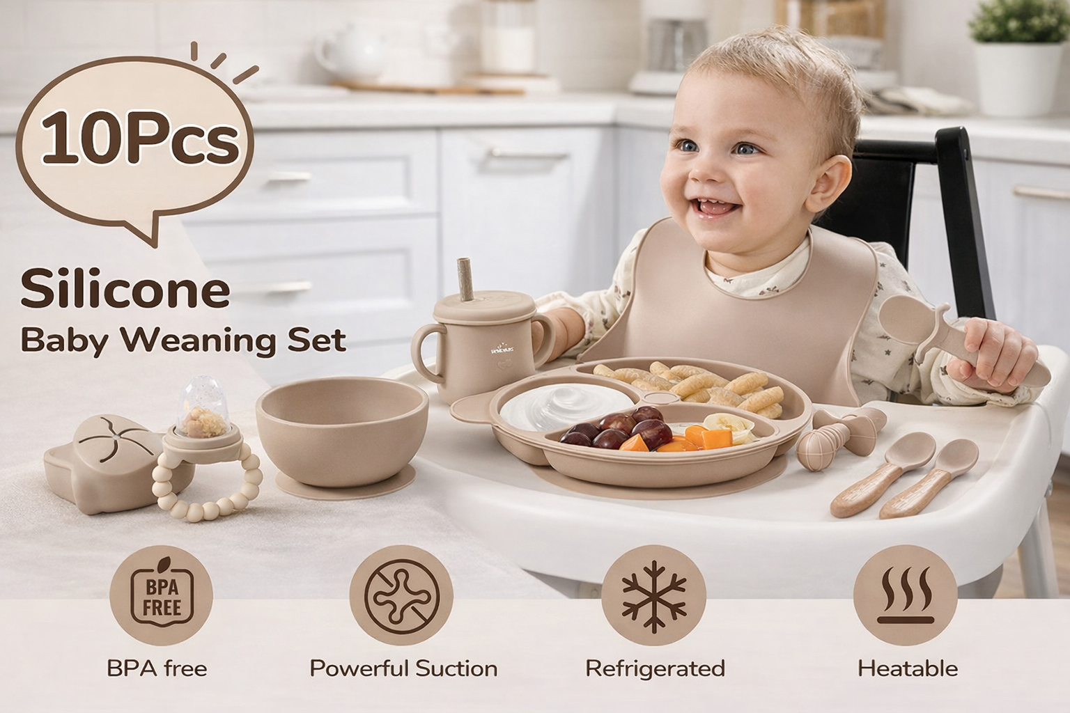 Premium 10-Piece Silicone Feeding Set made from safe, food-grade silicone for everyday use.Durable, easy to clean, and designed to make mealtimes comfortable and mess-free.